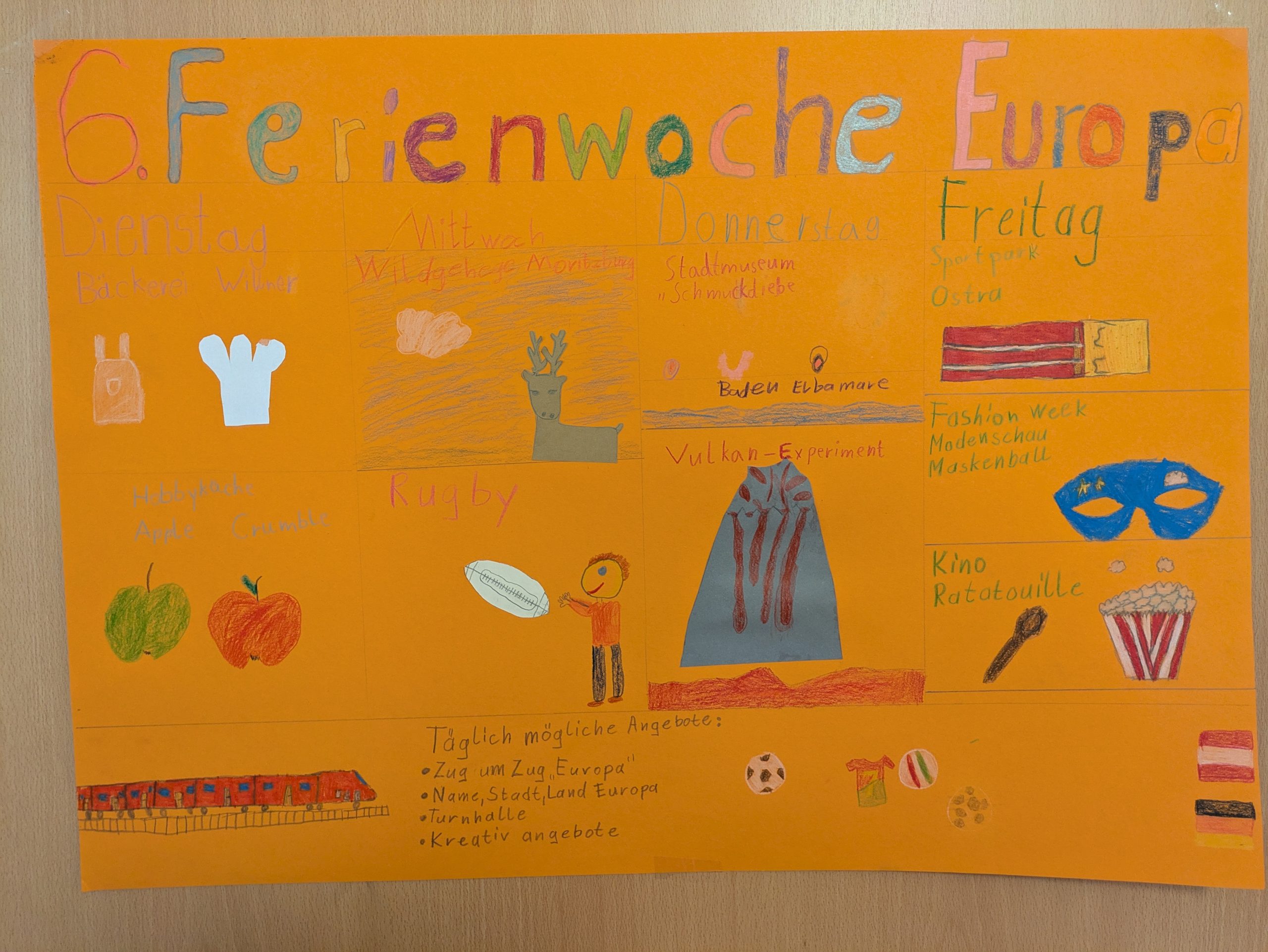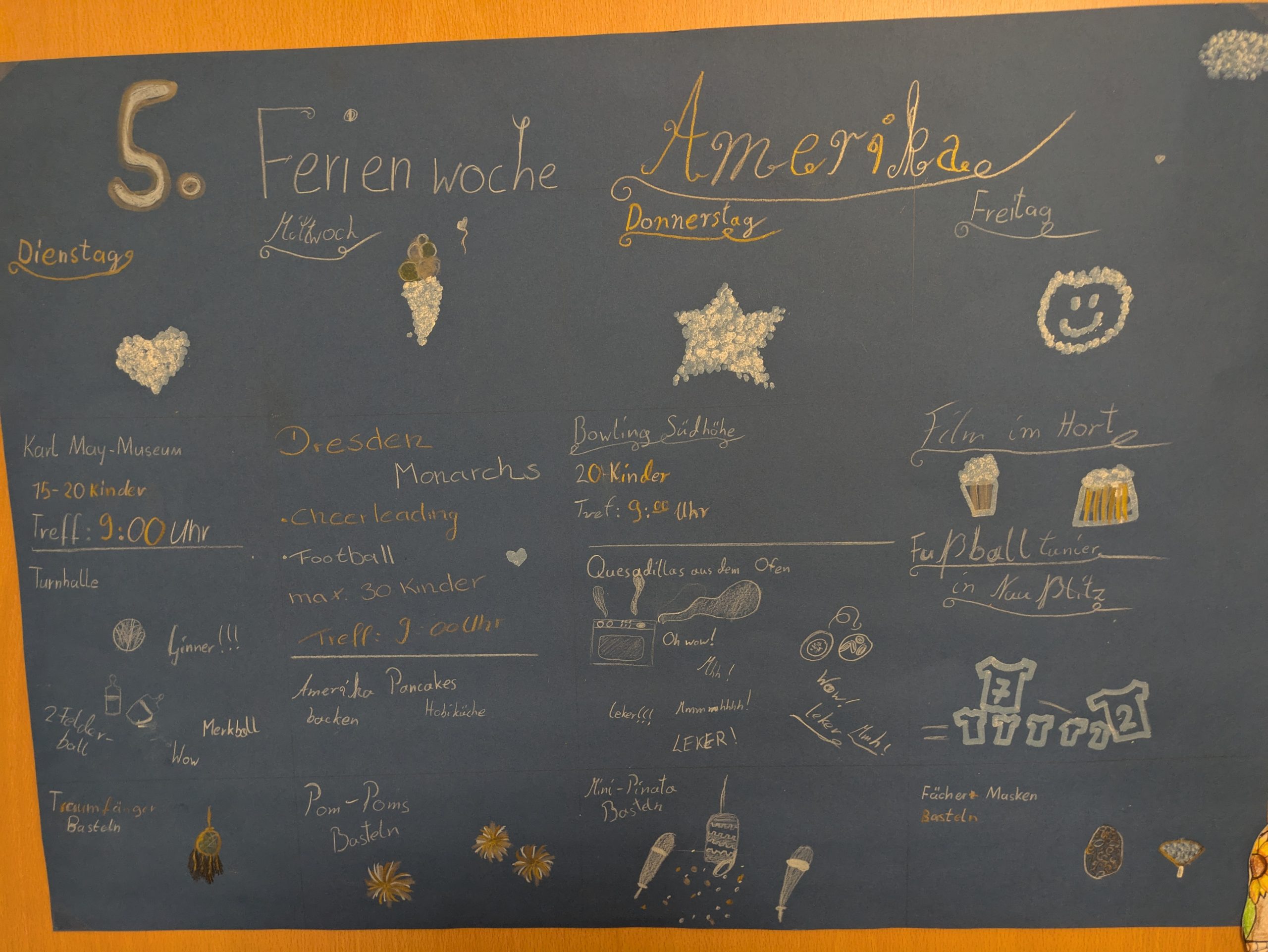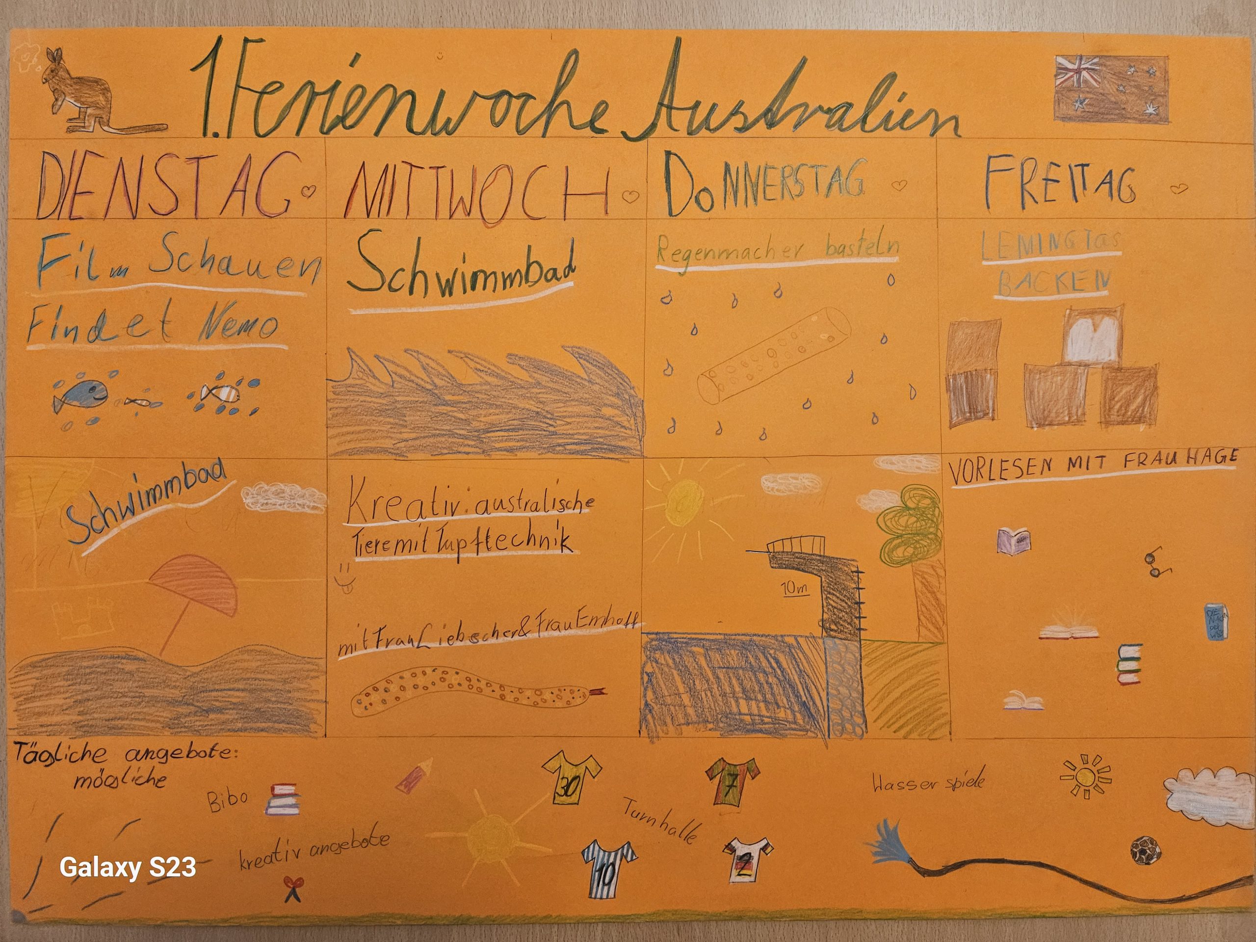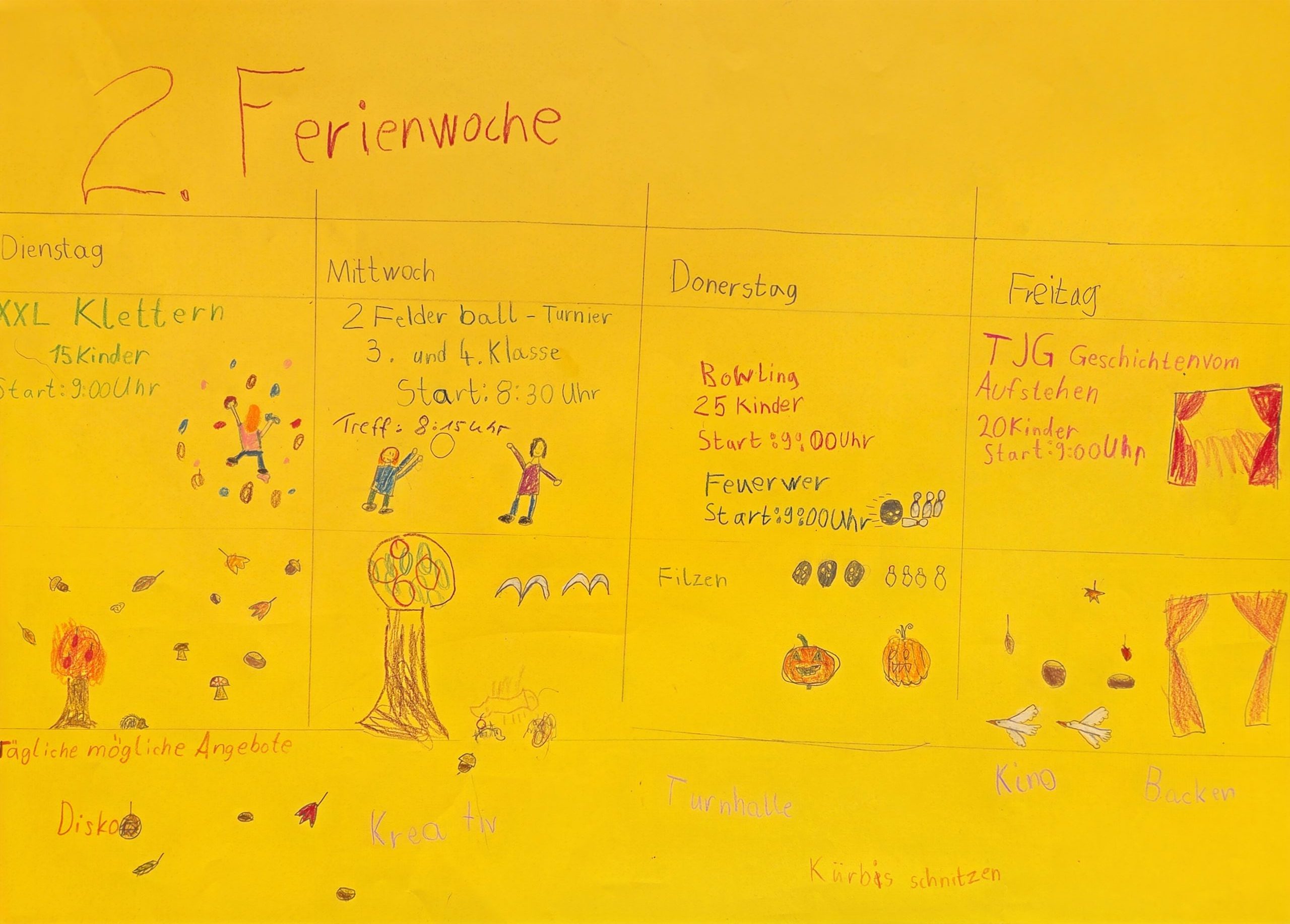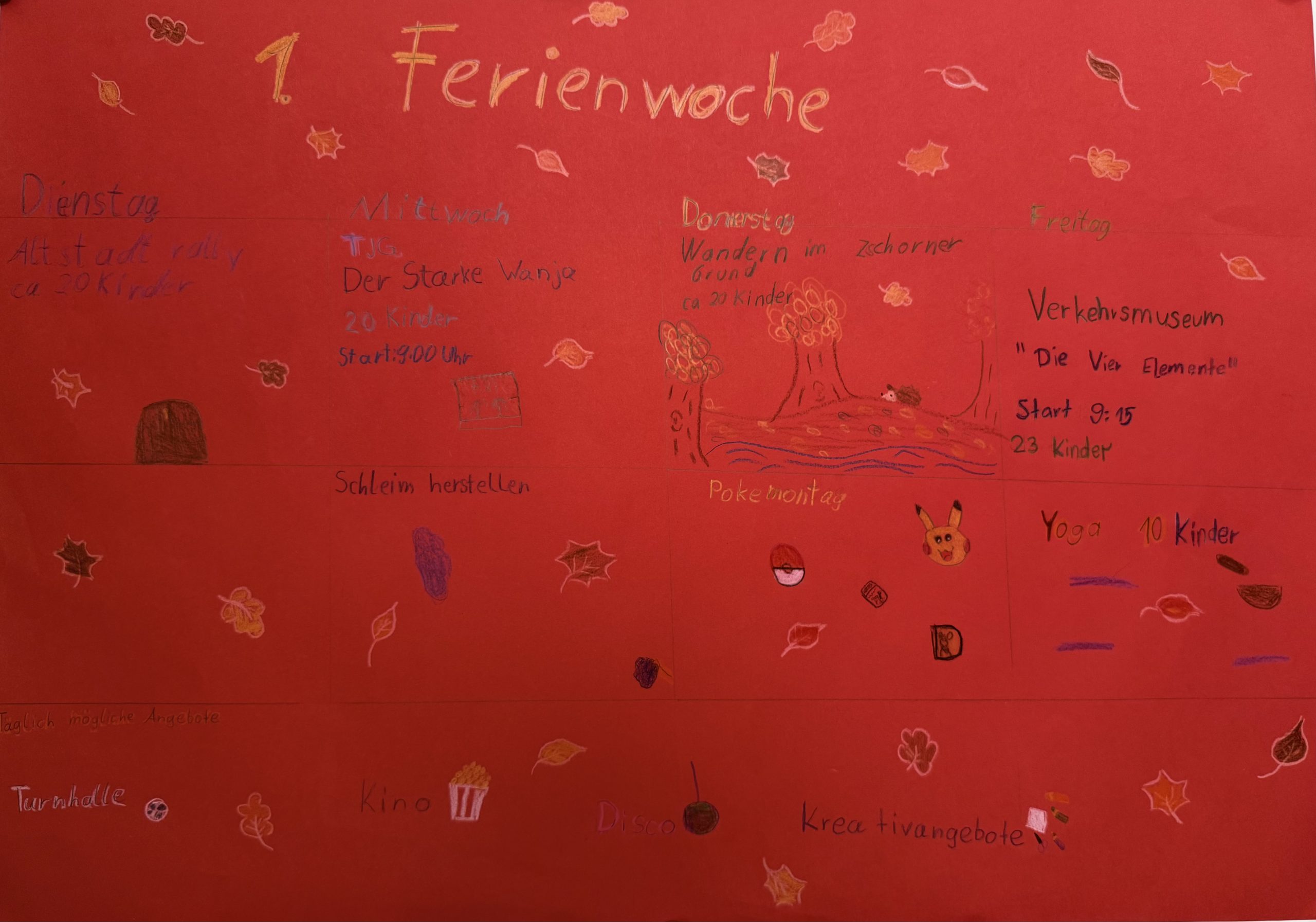 Nach dem Mittagessen wird das Ferienprogramm gemeinsam mit den Kindern vorgestellt und besprochen. An einem Aushang und auf unserer Internetseite ist das Wochenprogramm für alle Kinder und Eltern ersichtlich. Die Kinder haben die Möglichkeit sich bis zum Vortag für eine Angebot anzumelden.